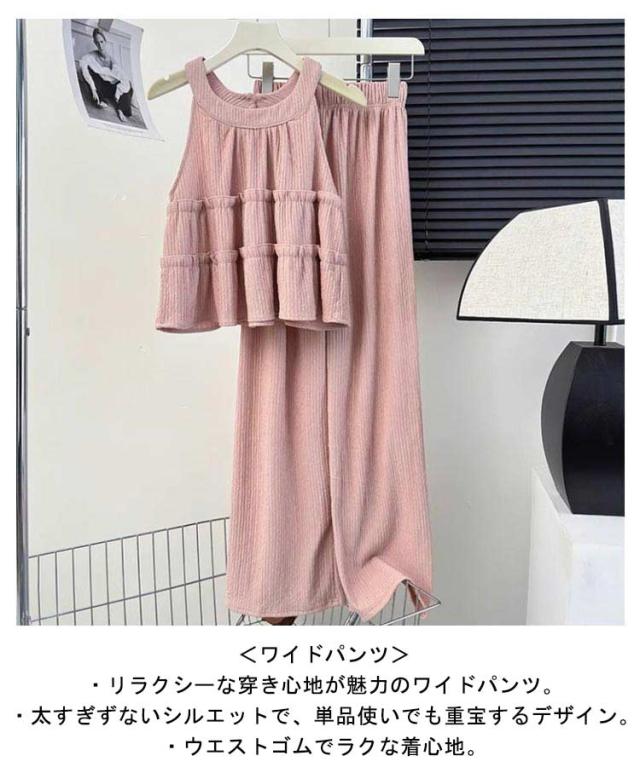 レディース きれいめ 夏 セットアップ ティアード 体型カバー フリル ブラウス 袖なし 40代 トップス 20代 30代 カジュアル ノースリーブブラウス フェミニン ウエストゴム 上下セット 無地 ワイドパンツ セットアップ 二次会 オフィス 大人 韓国ファッション
