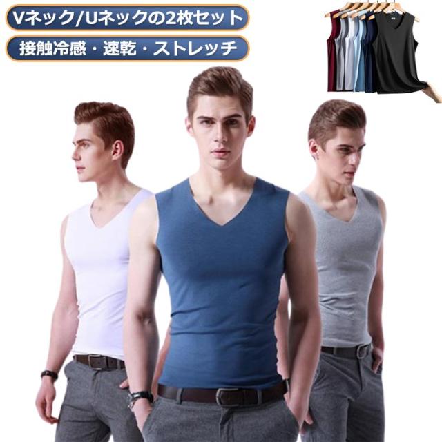 Uネック 男性 メンズ インナー タンクトップ Vネック 冷感 インナー シームレス 肌着 冷感 接触冷感 下着 スポーツ 吸汗速乾 下着 ノースリーブ 2枚セット 紳士 インナー 透けない タンクトップ 冷感 夏 ひんやり 涼しい 薄手
