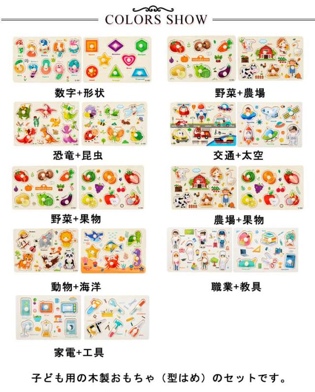 | 色 | 数字+形状 野菜+農場 恐竜+昆虫 交通+太空 野菜+果物 農場+果物 動物+海洋 職業+教具 家電+工具 |
