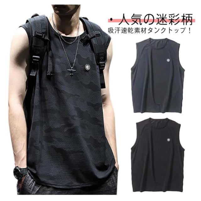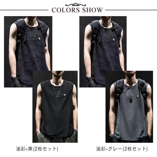 スポーツ 大きいサイズ タンクトップ ノースリーブ 吸汗速乾 涼しい 2枚セット ドライ カモフラージュ メッシュ 通気性 ストレッチ メンズ 袖なし タンクトップ ストリート カットソー トレンド ダンス 文化祭