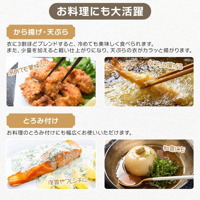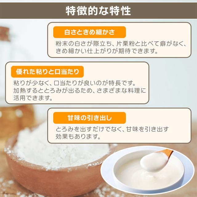 粉末の白さと粘りが少なく口当たりが良い特性があり、片栗粉と比べて癖がなくきめ細かい仕上がりです。加熱するととろみが出ます。