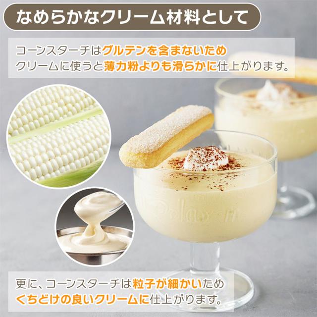 和菓子のもちとり粉や洋菓子のクリーム、お料理のとろみ付けに幅広くお使いいただけます。 また、少量を加えると軽い仕上がりになり、天ぷらの衣に入れるとカラッと揚がります。 白色とうもろこしを原料とし、洋菓子を白く仕上げたい場合に最適です。 |