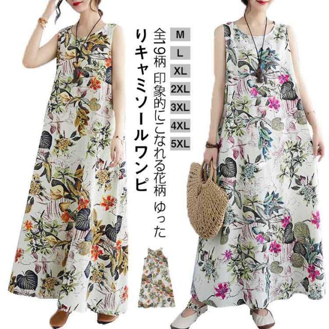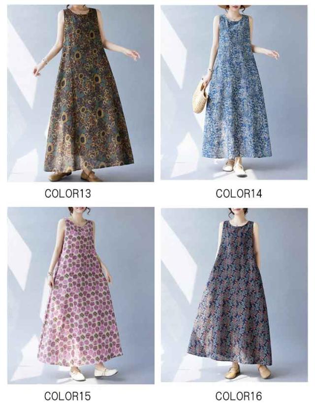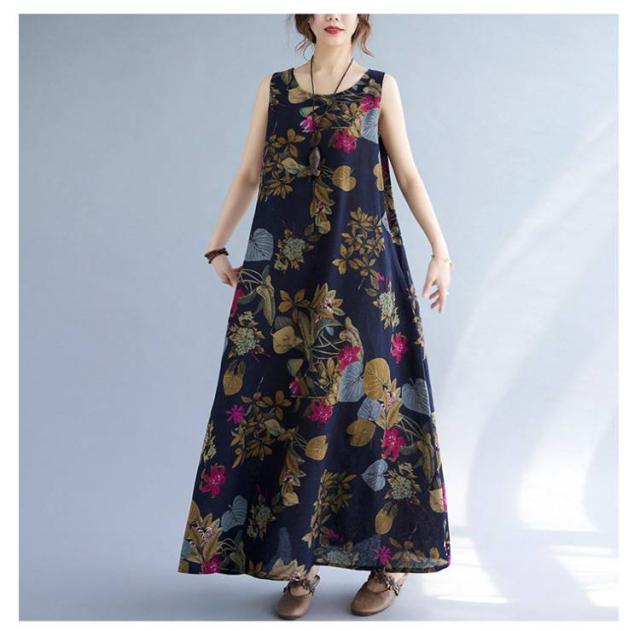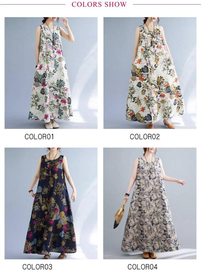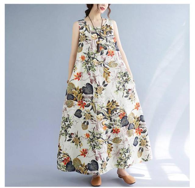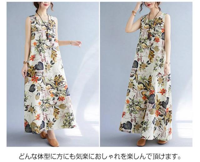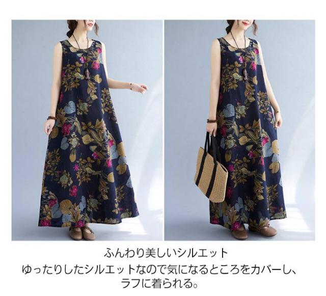 花柄 Uネック ロングワンピース ワンピース リネン ノースリーブ 麻 Aライン キャミソールワンピース 夏 サロペット オールインワン ジャンパースカート ロング ボタニカル ポケット プリント エスニック コットン ワンピース マキシ丈 大きいサイズ マキシワンピ 綿
