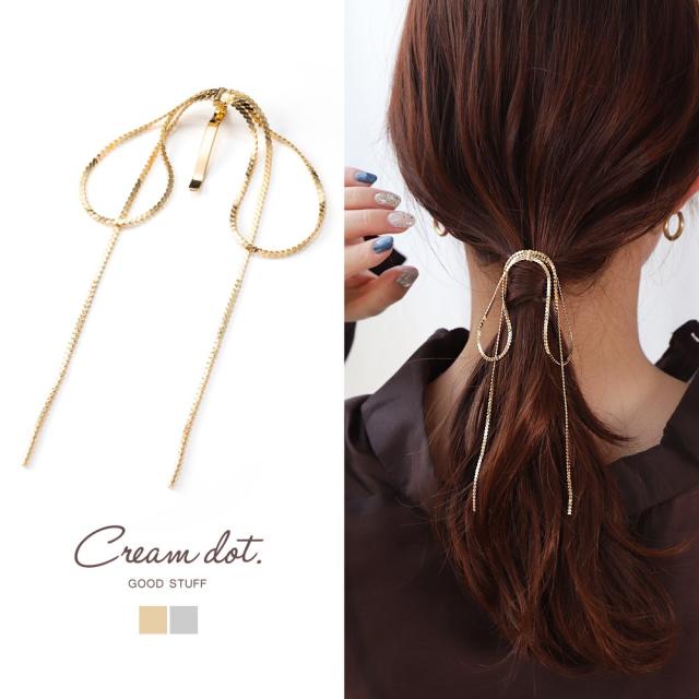 ツイストチェーンを結んだようなリボンモチーフのロングヘアカフ。光を受けて煌めくチェーンが髪に沿ってきれいにおちるデザインで、グッとこなれた印象に◎結び目に差し込むだけのワンタッチで即華やかに仕上がるアイテムです。