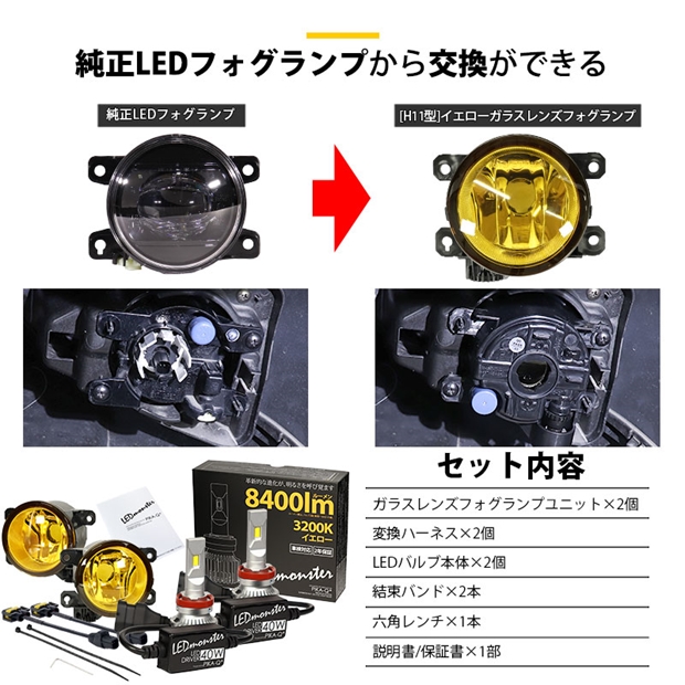単 H11 ホンダ 純正 対応 led イエローガラスレンズ フォグランプキット LED MONSTER L8400 フォグランプユニット 8400lm 黄色 3200K 44-M-5
