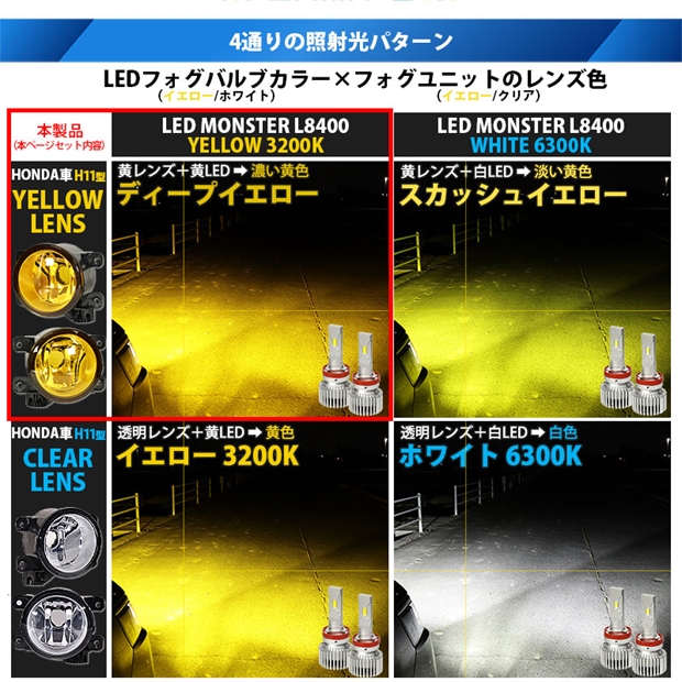 本製品はホンダ車の純正フォグランプユニットを「イエローガラスレンズフォグランプユニット」に交換し、ピカキュウLEDフォグバルブの人気モデル「LED MONSTER L8400」を装着するキットです。