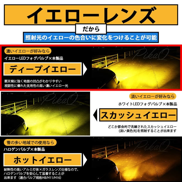 金型から設計したピカキュウオリジナルの幅細リフレクターにより抜群の配光を実現しています。イエローレンズは、装着するバルブカラーによりイエロー光の濃淡をつけることが出来ます。非点灯時も愛車の存在感をアピールします。
