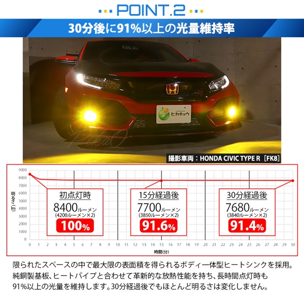 55W ハロゲンランプの明るさ2200lm(自社調べ)を超える十分な光量、全光束8400ルーメン、最強のモンスター級フォグランプ用LEDバルブです。放熱性能が高いため、長時間点灯後も91%以上の光量を維持します。30分経過後もほとんど明るさは変化しません。純正球の配光特性に徹底的にこだわり、純正バルブのフィラメントと中心を合わせた同じ位置にLEDの発光元を設定。理想的な配光を実現しています。