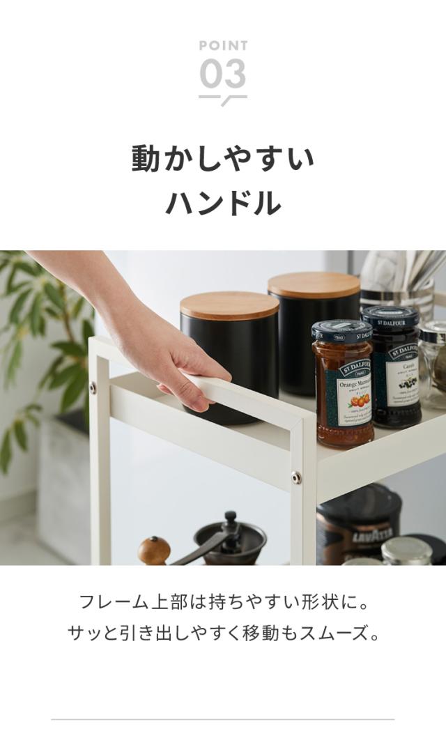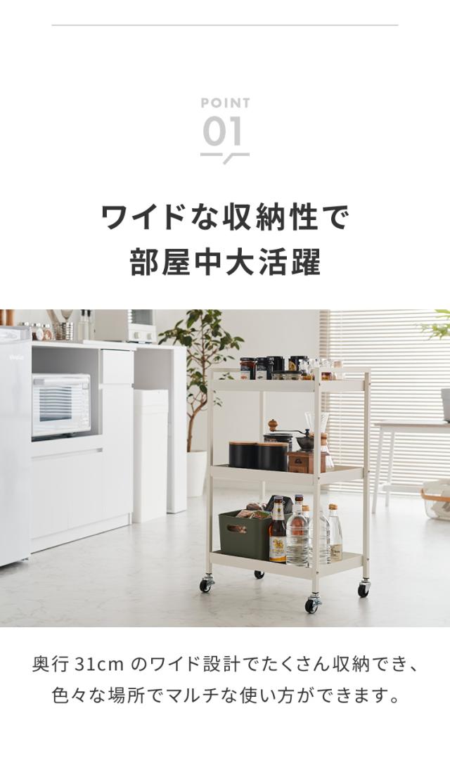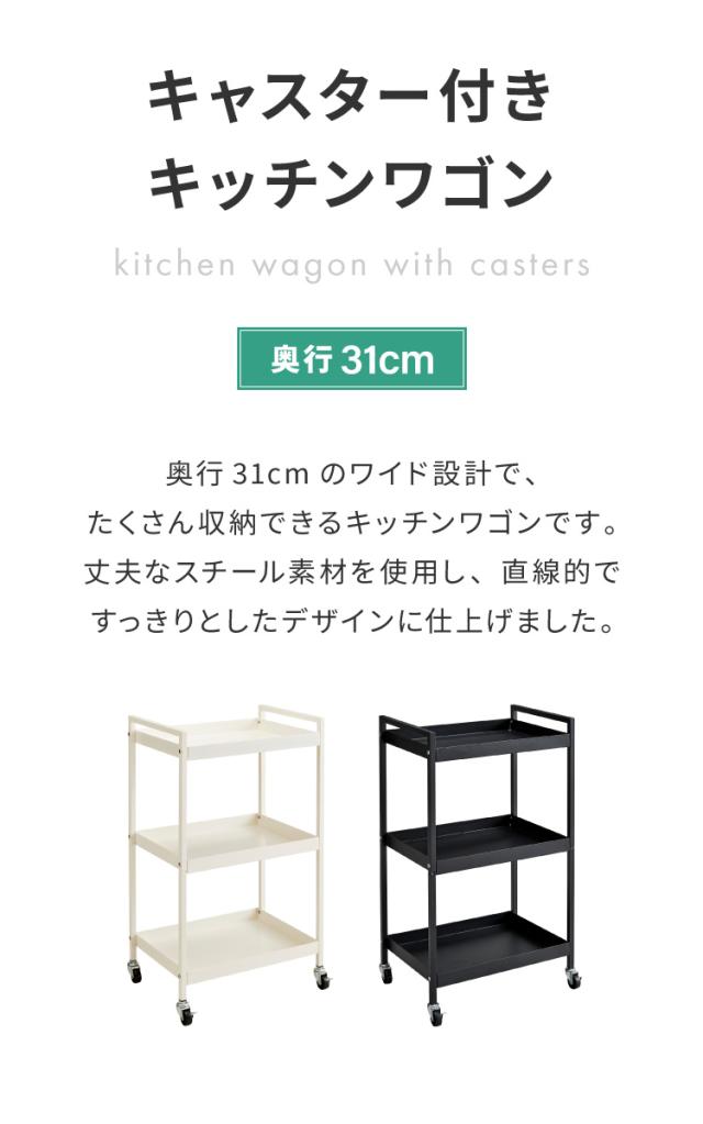 ・奥行きが31cmと、たくさん収納できるキッチンワゴンです。