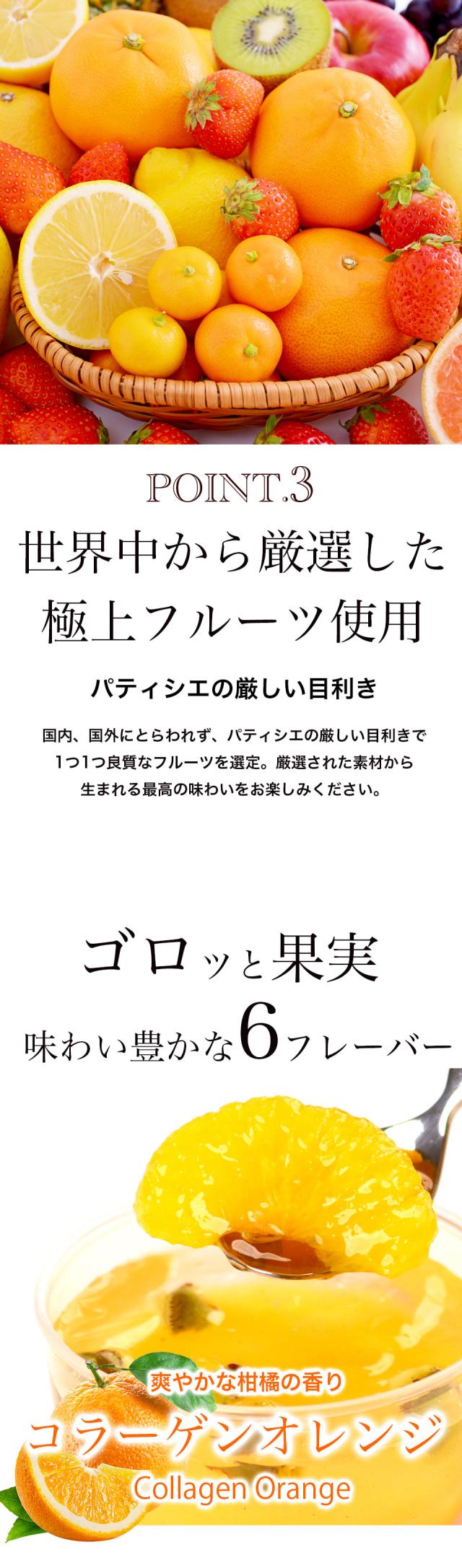 濃縮オレンジ果汁(ブラジル製造)、うんしゅうみかん、砂糖、オレンジ、キウイ、ゼリー用複合製剤(寒天)、コラーゲンペプチド(ゼラチンを含む)、ブランデー、マルトデキストリン、乳酸菌(殺菌)/塩化カルシウム、ゲル化剤(増粘多糖類)、乳化剤、酸味料
