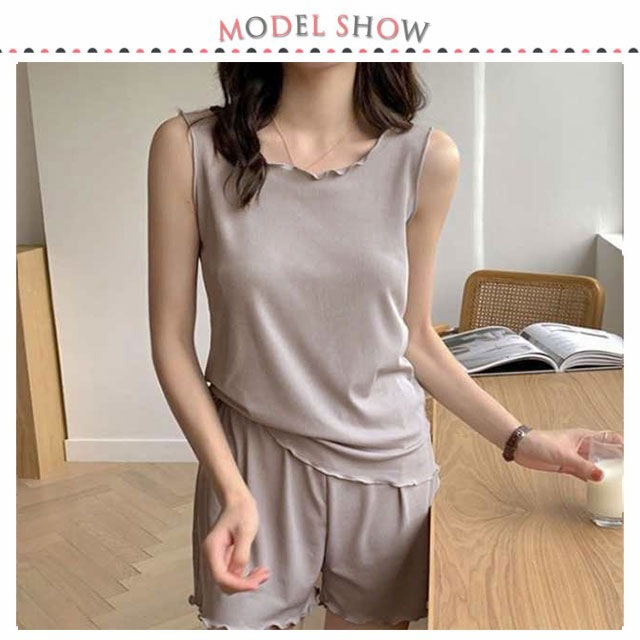| おうち時間もストレスなく可愛く! ひんやり接触冷感素材で、汗ばむ季節もさらさらとても快適。 シンプルながら大人可愛いをかねるセットアップのルームウェア。 柔らかで肌触り優しい生地なので、ストレスフリーの着心地◎ タンクトップ×ショートパンツの上下セットパジャマ、涼しくて暑い季節に最適! 衿、袖口、裾のメロウフリフが女らしい可愛い。 | |
