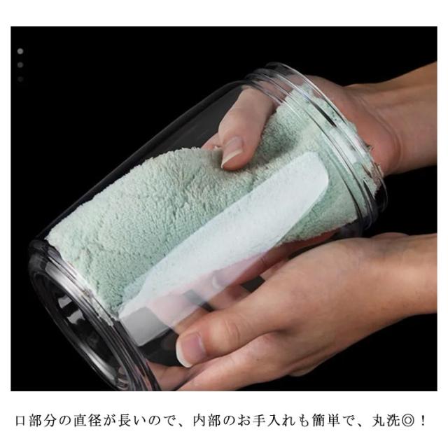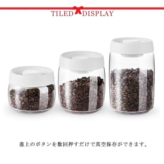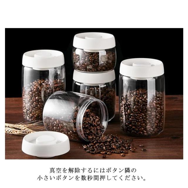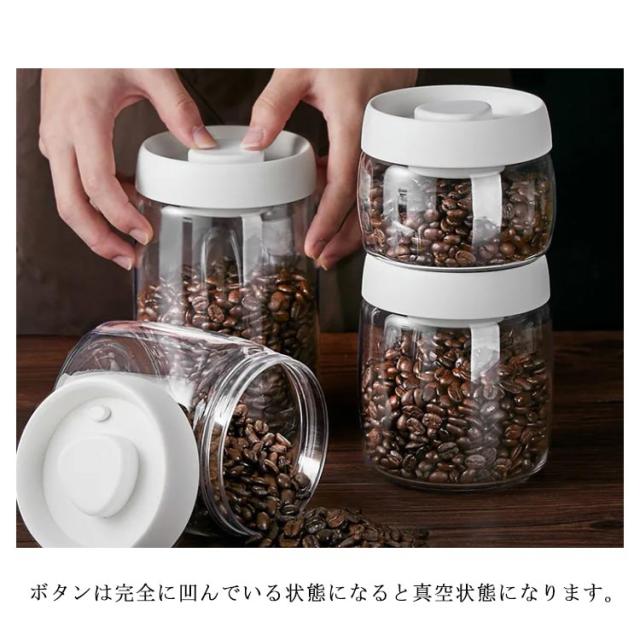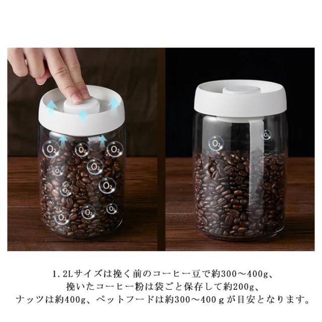 | 蓋上のボタンを数回押すだけで真空保存ができます。 ボタンは完全に凹んでいる状態になると真空状態になります。 真空を解除するにはボタン隣の小さいボタンを数秒間押してください。 口部分の直径が長いので、内部のお手入れも簡単で、丸洗◎! 電池やコンセントがいらないので使う場所を選びません。 1.2Lサイズは挽く前のコーヒー豆で約300-400g、挽いたコーヒー粉は袋ごと保存して約200g、ナッツは約400g、ペットフードは約300-400gが目安となります。 電子レンジ、オーブン使用不可。 | |