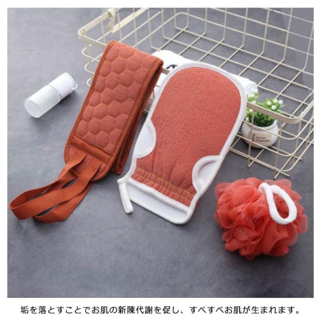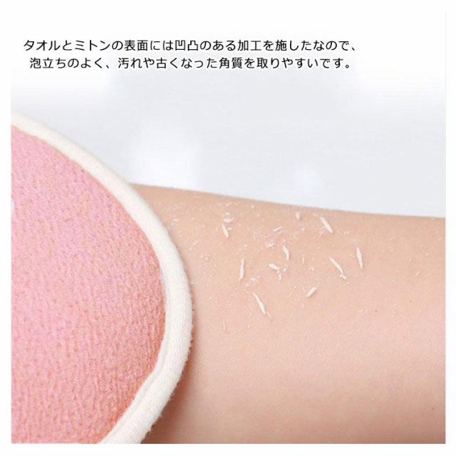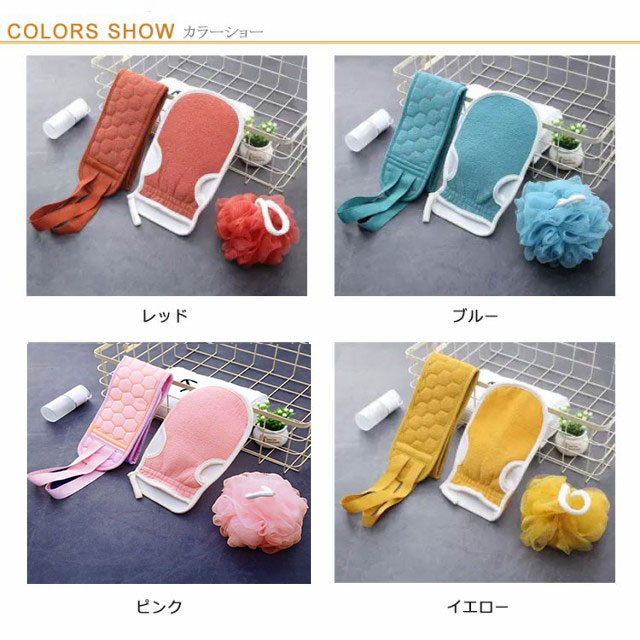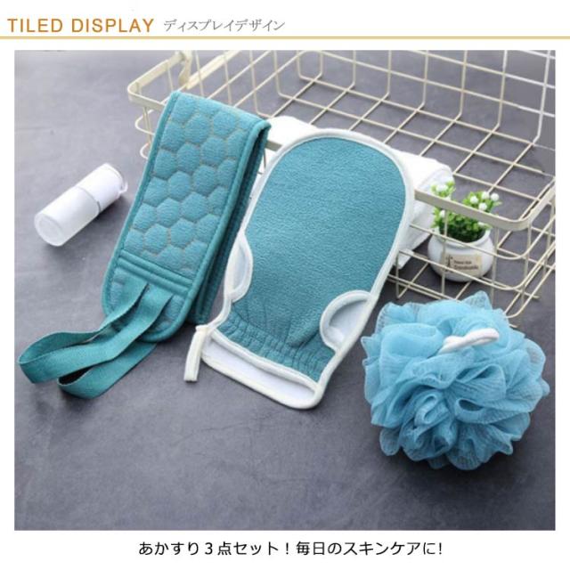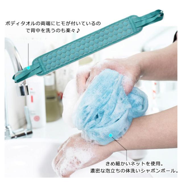 | あかすり3点セット!毎日のスキンケアに! ボディタオルの両端にヒモが付いているので背中を洗うのも楽々♪ タオルとミトンの表面には凹凸のある加工を施したなので、泡立ちのよく、汚れや古くなった角質を取りやすいです。 きめ細かいネットを使用。濃密な泡立ちの体洗いシャボンボール。 垢を落とすことでお肌の新陳代謝を促し、すべすべお肌が生まれます。 | |