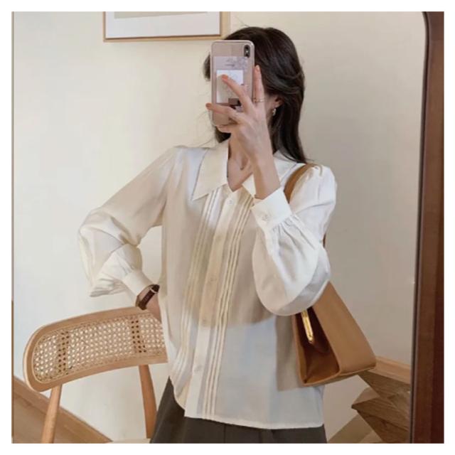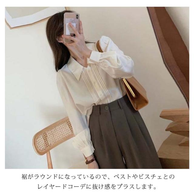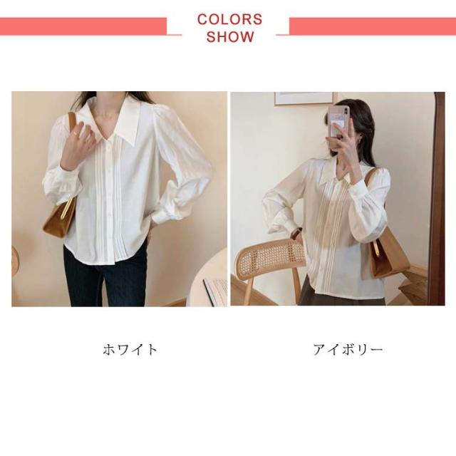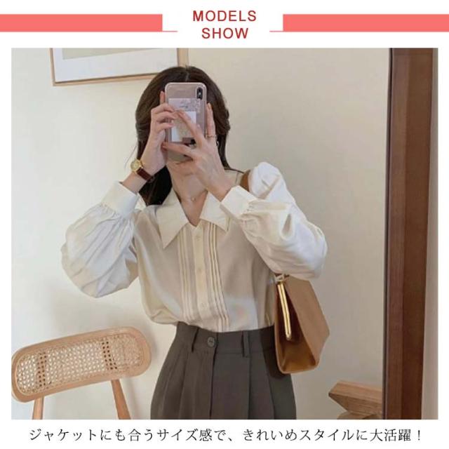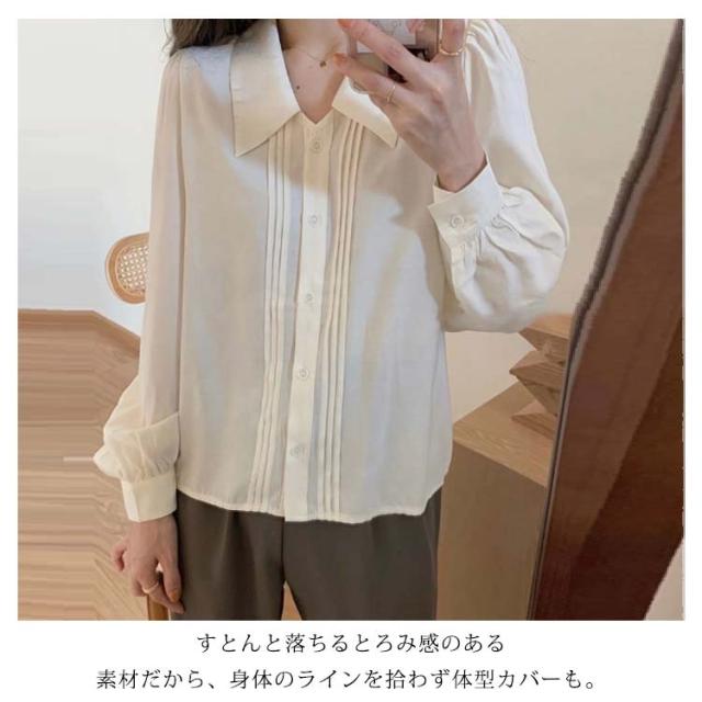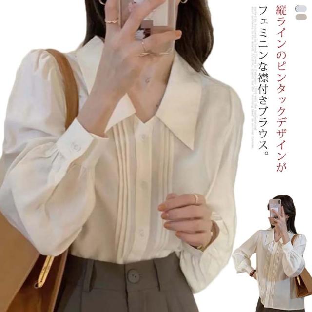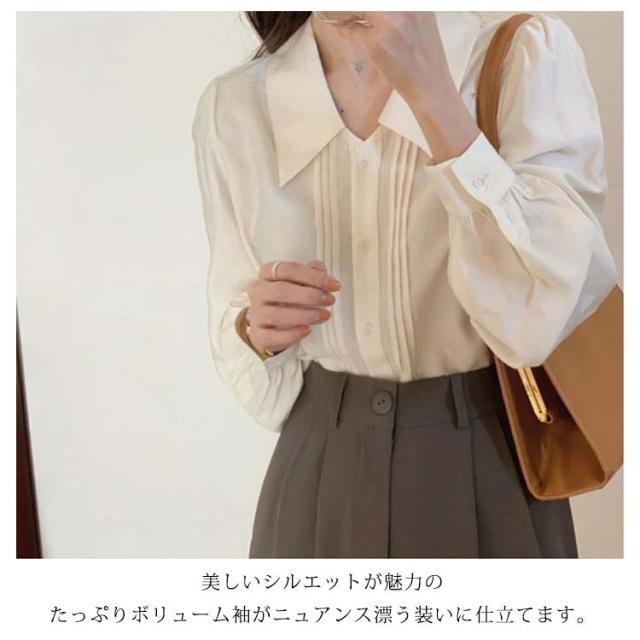 ボリュームスリーブ タックブラウス レディース トップス ブラウス シャツ 長袖 オフィス 開襟 ワイシャツ 無地 ボリューム スリーブタック フェミニン きれいめ ガーリー 上品 ポロ襟 ピンタックブラウス 送料無料