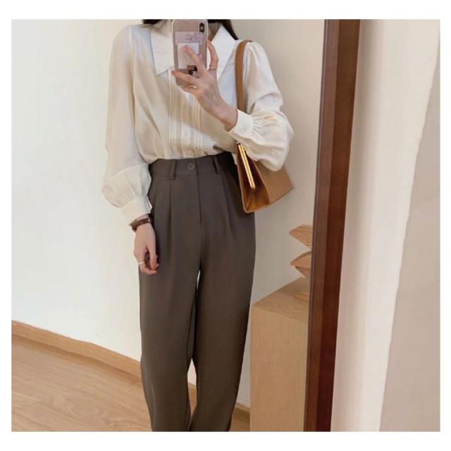 | 縦ラインのピンタックデザインがフェミニンな襟付きブラウス。 すとんと落ちるとろみ感のある素材だから、身体のラインを拾わず体型カバーも。 美しいシルエットが魅力のたっぷりボリューム袖がニュアンス漂う装いに仕立てます。 裾がラウンドになっているので、ベストやビスチェとのレイヤードコーデに抜け感をプラスします。 ジャケットにも合うサイズ感で、きれいめスタイルに大活躍! | |