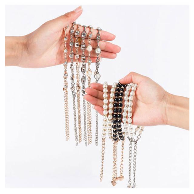 | レディースシューズストラップ。アンクル式は華奢な足首を強調、パールとダイヤならではの存在感で更に女度増し。 シューズの脱げ止めにもアンクレットとしても、機能性とファッション性兼ね備える。 チェーン付きなので、長さはお好み次第で調節できるのも嬉しいポイント。 装着簡単で誰でも使え、カカト裏に粘着するタイプなので縫製不用。 | |