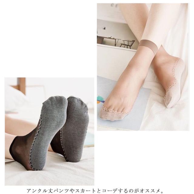 | サンダル・パンプスに相性抜群のシースルーソックス。 薄くて履き心地抜群! 落ち防止のゴムつき、便利さアップ! つま先や足裏は綿素材で、吸汗性・通気性よく、蒸れないから履き心地◎ アンクル丈パンツやスカートとコーデするのがオススメ。 | |