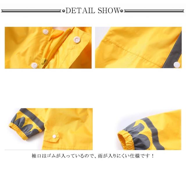 | フードも前半分が透明仕様バイザーを付いており、雨水が顔にかかりにくくて安心。 反射テープ付きで、雨の日の保育園や幼稚園、小学校への通学にぴったり!暗い道でも安全。 袖口はゴムが入っているので、雨が入りにくい仕様です! おしゃれでシンプルさを追求した、男の子にも女の子にも似合う、色鮮やかでかわいいレインコートです。 | |
