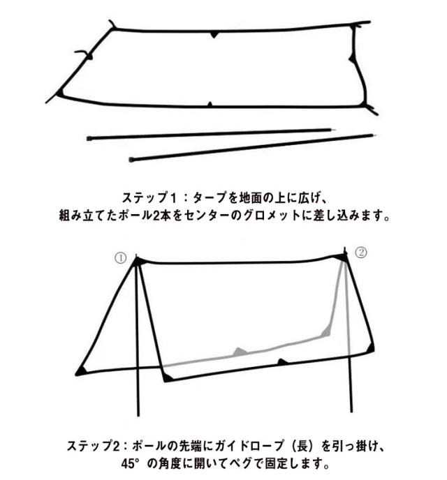 | 軽量ヘキサタープが登場。 持ち運びやすいキャリーバッグ付き。 組み立てが簡単。 安心して使えるアクセサリー。 タープがUVカット加工されているので女性やお子様にも安心! 防水オックスフォード生地で急な雨にも安心。 ステップ1:タープを地面の上に広げ、組み立てたポール2本をセンターのグロメットに差し込みます。 ステップ2:ポールの先端にガイドロープ(長)を引っ掛け、45°の角度に開いてペグで固定します。 ステップ3:ポールを立て、ロープを取り付け、ペグで固定します。 ステップ4:ポールの角度やロープの張り具合を調節したら完成です。 | |