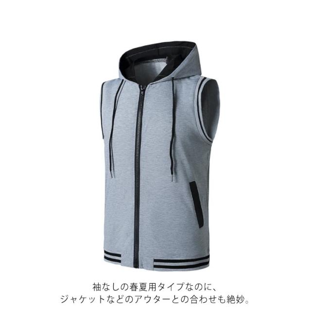 ノースリーブパーカー ジップアップパーカー フード付き ベスト メンズ スウェットパーカー 袖なし Tシャツ パーカー 細身 ベスト 前開き ジップアップ フィットネス ジム スポーツウエア カジュアル 夏物
