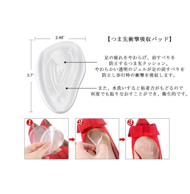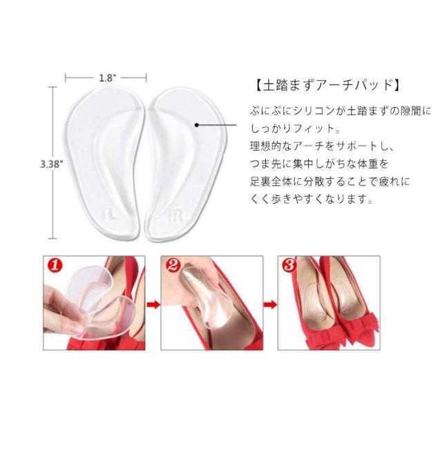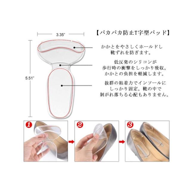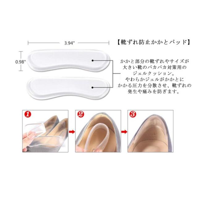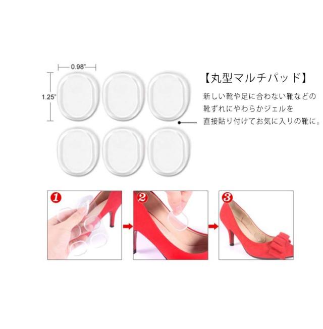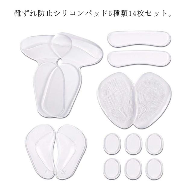 | 靴ずれ防止シリコンパッド5種類14枚セット。 【パカパカ防止T字型パッド】 かかとをやさしくホールドし靴ずれを防ぎます。 低反発のシリコンが歩行時の衝撃をしっかり吸収。かかとの負担を軽減します。 抜群の粘着力でインソールにしっかり固定。靴の中で?がれ落ちる心配もありません。 【つま先衝撃吸収パッド】 足の疲れをやわらげ、前すべりを防止するつま先クッション。やわらかい透明のジェルが足の前すべりを防止し歩行時の衝撃を吸収します。 また、水洗いすると粘着力がもどるので何度でも貼りなおすことができ、衛生的です。 【靴ずれ防止かかとパッド】 かかと部分の靴ずれやサイズが大きい靴のパカパカ対策用のジェルクッション。 やわらかジェルがかかとにかかる圧力を分散させ、靴ずれの発生や痛みを防ぎます。 【丸型マルチパッド】 新しい靴や足に合わない靴などの靴ずれにやわらかジェルを直接貼り付けてお気に入りの靴に。 【土踏まずアーチパッド】 ぷにぷにシリコンが土踏まずの隙間にしっかりフィット。 理想的なアーチをサポートし、つま先に集中しがちな体重を足裏全体に分散することで疲れにくく歩きやすくなります。 【セット内容】 1.パカパカ防止T字型パッド(左右兼用2枚):長さ14cm×幅8.5cm×厚さ0.5cm 2.つま先衝撃吸収パッド(左右各2枚):長さ10.2cm×幅6.8cm×厚さ0.25cm 3.靴ずれ防止かかとパッド(左右兼用2枚):長さ11cm×幅6.7cm×厚さ0.25cm 4.丸型マルチパッド(左右兼用6枚):長さ10.6cm×幅8cm×厚さ0.2cm 5.土踏まずアーチパッド(左右各2枚):長さ10cm×幅5.5cm×厚さ0.5cm | |