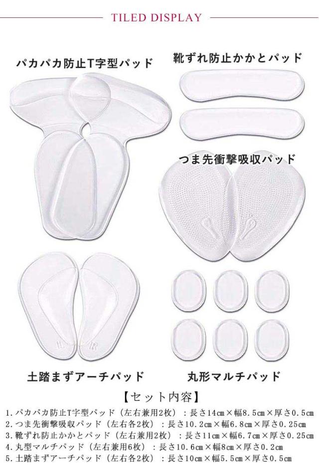 | サイズについての説明 | 【セット内容】 1.パカパカ防止T字型パッド(左右兼用2枚):長さ14cm×幅8.5cm×厚さ0.5cm 2.つま先衝撃吸収パッド(左右各2枚):長さ10.2cm×幅6.8cm×厚さ0.25cm 3.靴ずれ防止かかとパッド(左右兼用2枚):長さ11cm×幅6.7cm×厚さ0.25cm 4.丸形マルチパッド(左右兼用6枚):長さ10.6cm×幅8cm×厚さ0.2cm 5.土踏まずアーチパッド(左右各2枚):長さ10cm×幅5.5cm×厚さ0.5cm |