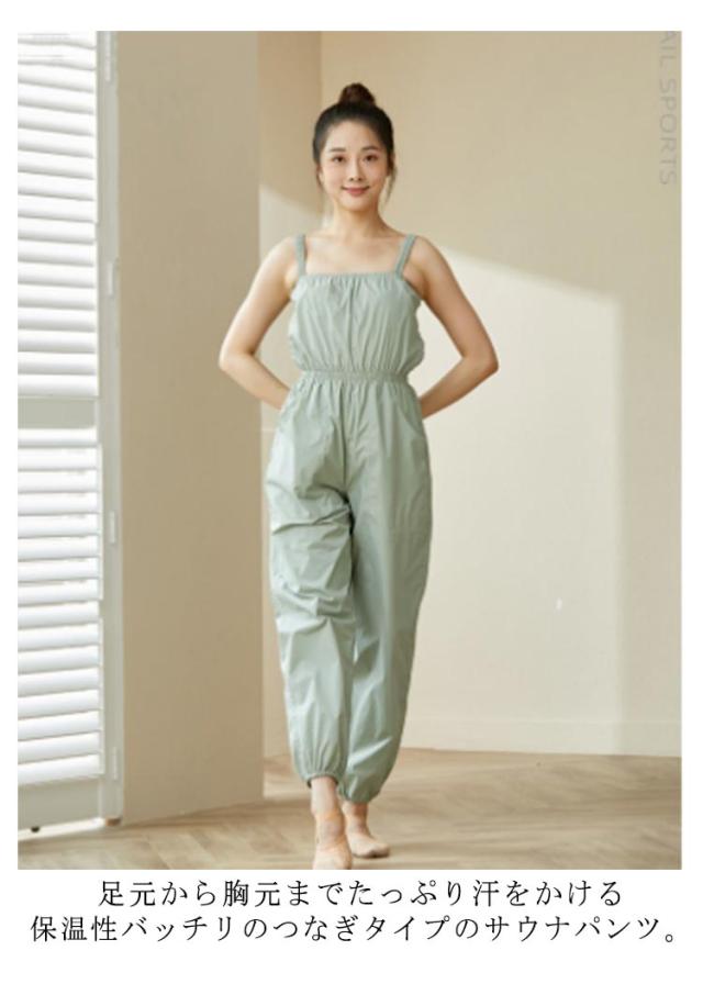 | しっかり発汗しながら、お洒落も楽しみたい。 薄めのやわらかい生地で動きやすく、たっぷり汗がかけます。 足元から胸元までたっぷり汗をかける保温性バッチリのつなぎタイプのサウナパンツ。 足首までのロングサイズで密閉されます。 ヒップ、太もも周りはゆったりサイズなので、着たままでも踊りやすく便利に使えるウォームアップです。 レッスン前後のストレッチや楽屋着用にどうぞ! 本気でダイエットしたい方にもオススメです。 | |