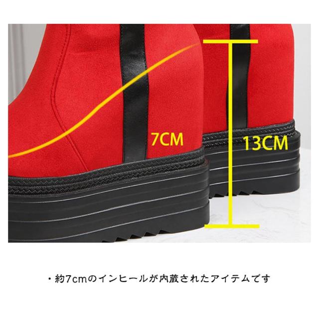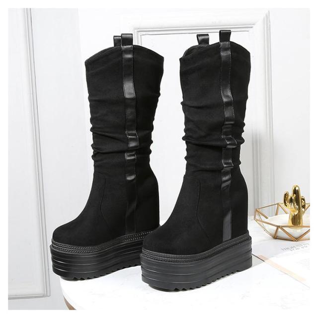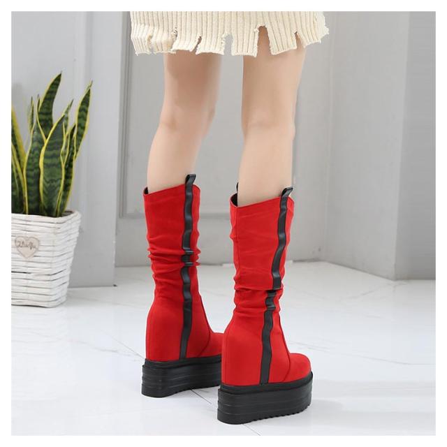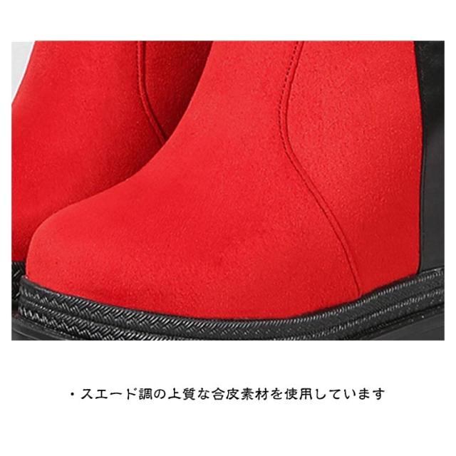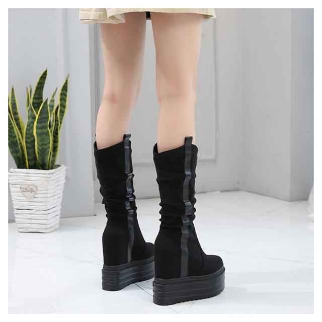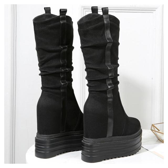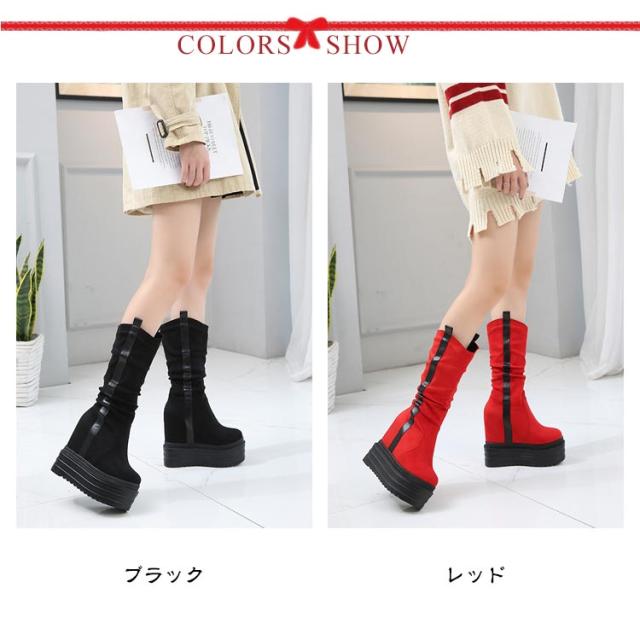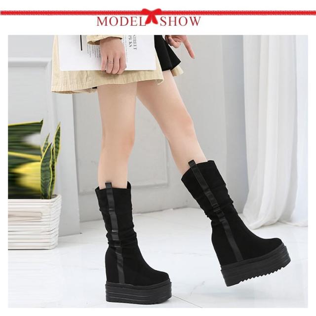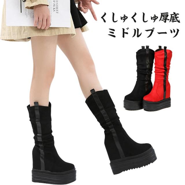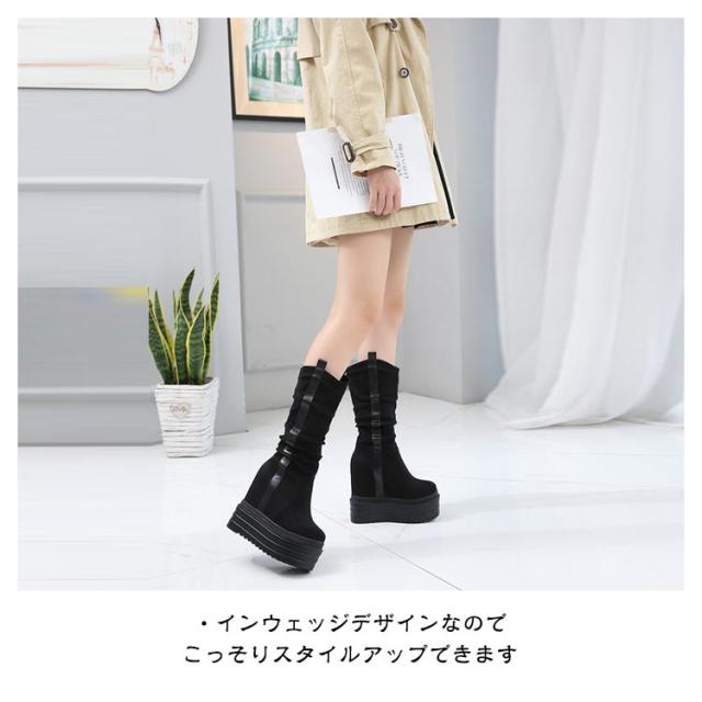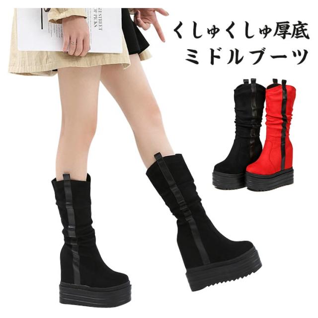ミドルブーツ 厚底ブーツ 裏起毛 くしゅくしゅブーツ レディース ウエッジソール 7cmインヒール スエード調 美脚効果 軽量 合成皮革 カジュアル きれいめ おしゃれ 暖かい 秋 冬 無地 全2色