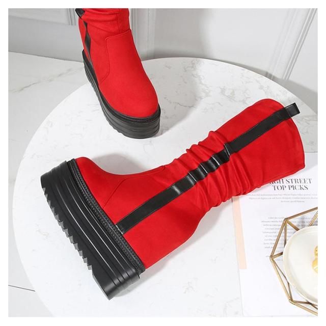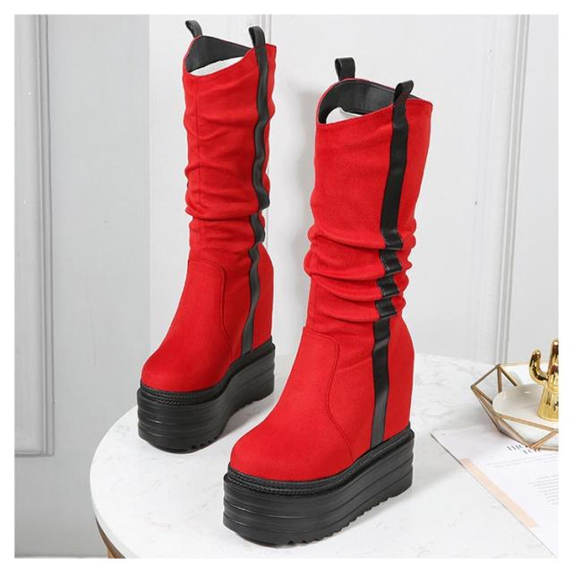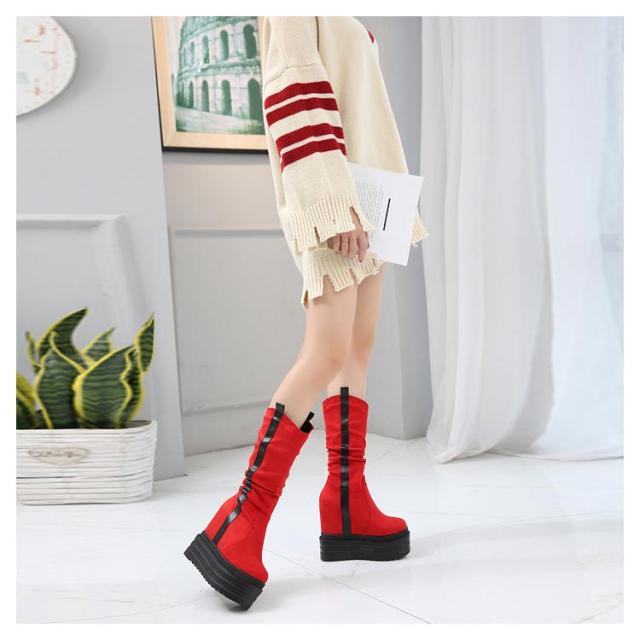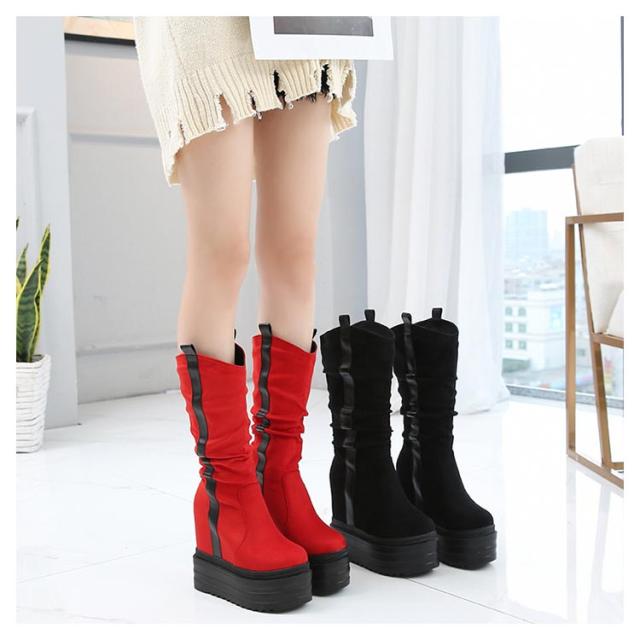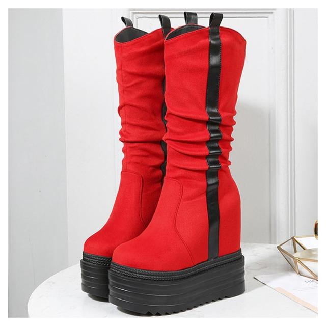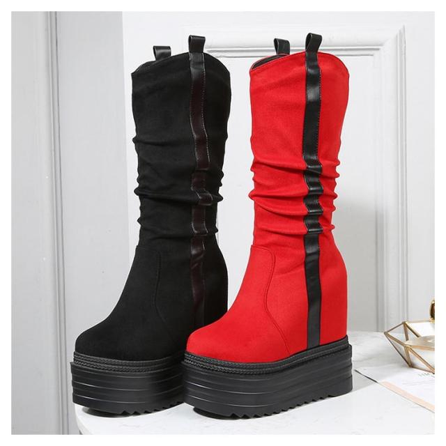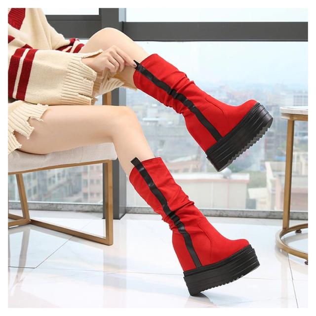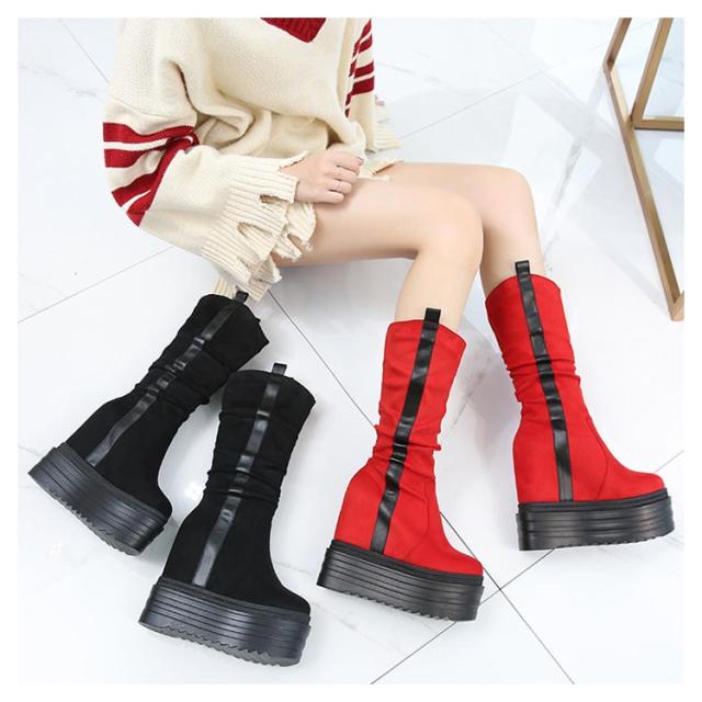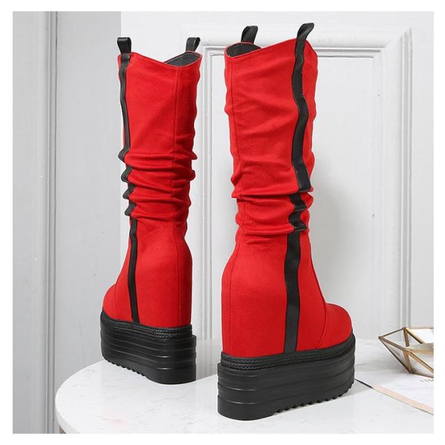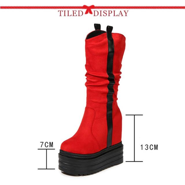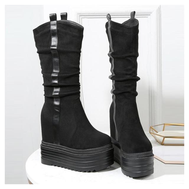 ミドルブーツ 厚底ブーツ 裏起毛 くしゅくしゅブーツ レディース ウエッジソール 7cmインヒール スエード調 美脚効果 軽量 合成皮革 カジュアル きれいめ おしゃれ 暖かい 秋 冬 無地 全2色