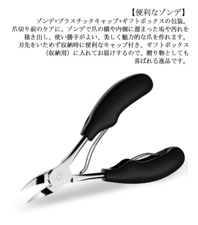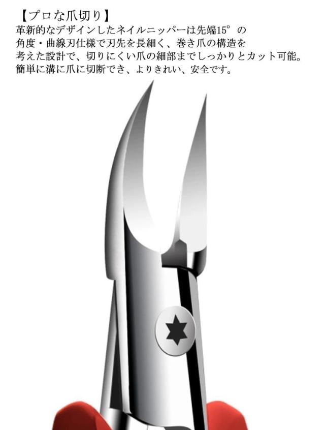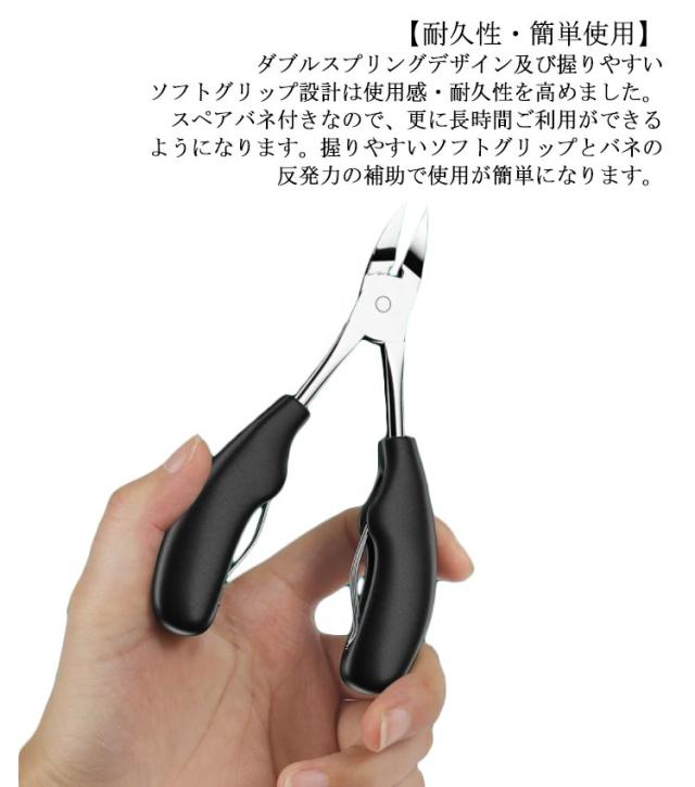| 【プロな爪切り】革新的なデザインしたネイルニッパーは先端15°の角度・曲線刃仕様で刃先を長細く、巻き爪の構造を考えた設計で、切りにくい爪の細部までしっかりとカット可能。簡単に溝に爪に切断でき、よりきれい、安全です。 【硬い爪・巻き爪用ニッパーつめきり】サビにくいステンレス製爪切りニッパーは非常に鋭い、握りやすいソフトグリップとバネの反発力の補助で、巻きつめ、陥入爪、分厚い爪、硬い爪などでお悩みの方は簡単にカット可能です、女性及び年上には軽い力でも一気に切れます。 【耐久性・簡単使用】ダブルスプリングデザイン及び握りやすいソフトグリップ設計は使用感・耐久性を高めました。スペアバネ付きなので、更に長時間ご利用ができるようになります。握りやすいソフトグリップとバネの反発力の補助で使用が簡単になります。 【便利なゾンデ】ゾンデ+プラスチックキャップ+ギフトボックスの包装。爪切り前のケアに、ゾンデで爪の横や内側に溜まった垢や汚れを掻き出し、使い勝手がよい、美しく魅力的な爪を作れます。刃先をいためず収納時に便利なキャップ付き、ギフトボックス(収納用)に入れてお届けするので、贈り物としても喜ばれる逸品です。 | |