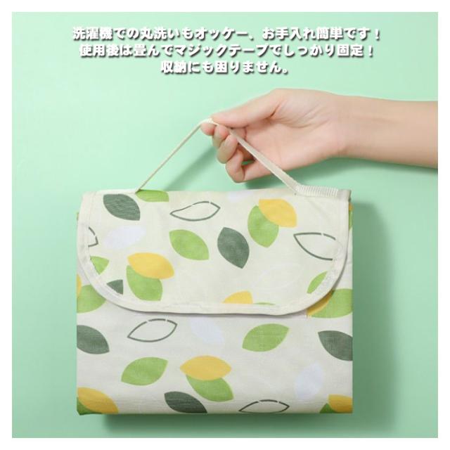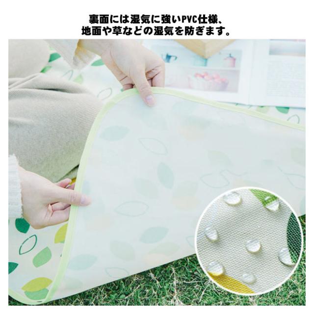 | ピックアップやお花見・運動会などオールシーズン使えるレジャーシート 防水性に優れているため、こぼしてもすぐに拭きとれます。 通気性も良いので蒸れにくく、素足でも快適に過ごせます。 裏面には湿気に強いPVC仕様、地面や草などの湿気を防ぎます。 洗濯機での丸洗いもオッケー、お手入れ簡単です! 使用後は畳んでマジックテープでしっかり固定!収納にも困りません。 | |