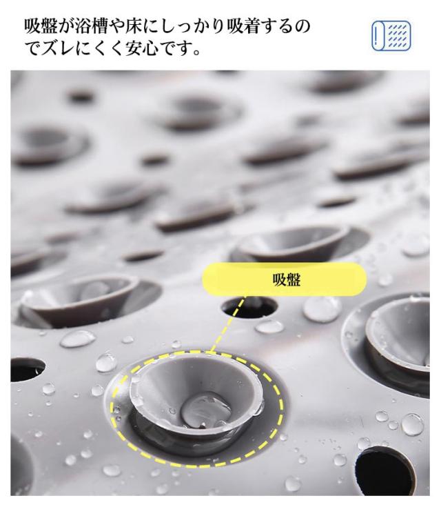 | 小さな子供から妊婦さん高齢者まで安心して入れるお風呂ライフへ。 浴槽への出入りの時や入浴中の滑りや転倒を防止してくれます。 突起設計と穴があり吸着力と水はけ(抗菌)にこだわりズレたり動いたりする心配はいりません。 吸盤が浴槽や床にしっかり吸着するのでズレにくく安心です。 浴槽、浴室、洗い場の危険から滑り止めマットが家族を守ります。 足洗いブラシ付きのデザインで足の角質除去、、臭い予防などが期待できます。 柔らかくて曲げられるので使わない時は丸めて収納できます。 | |
