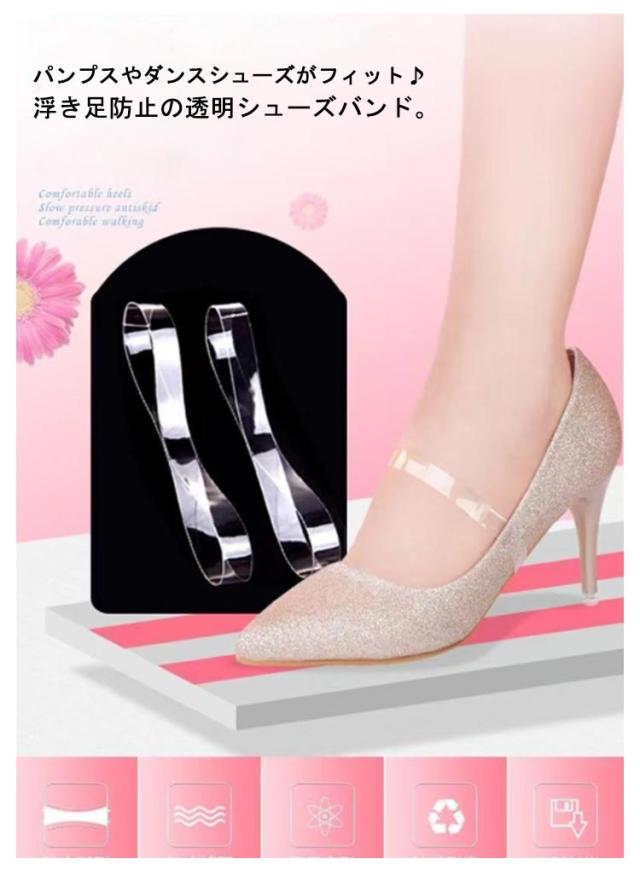 | パンプスやダンスシューズがフィット♪浮き足防止の透明シューズバンド。 パンプスの悩みを解消!パンプスと足の甲がフィットするから歩きやすい。 透明タイプなので靴のデザインを損ないません。足と靴を密着させることで、足の疲れも軽減♪ シューズクリップを挟んであなた好みのシューズバンドにするのも。 日常生活はもちろん、就職活動や結婚式などでのヒール音を控えたい!という方にもオススメです◎ | |