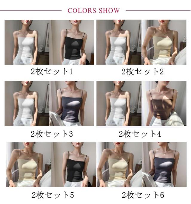 | 2枚セット!カップ付きキャミソールです。 ノンワイヤーで、ストレスなく、伸縮性抜群でいろいろな運動してもお肌にフィット。 カップ付のキャミソールなら、そのまま素肌に着用OK! しなやかな肌触りで伸縮性もバツグン! オールシーズン活躍するインナーキャミソールです。 ダンスやヨガ・エクササイズのウェアとしもお薦めです。 トップスとしてもインナーとしても着られるカップの付いたチューブトップトップスです。 | |