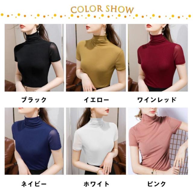 ハイネック カットソー レディース 半袖 タートルネック ボトルネック tシャツ ストレッチ 薄手 インナー トップス レイヤード 重ね着 伸縮性 袖 透け 首元保護 UV対策 日よけ防止 冷房対策 大きいサイズ おしゃれ 無地 シンプル きれいめ 送料無料