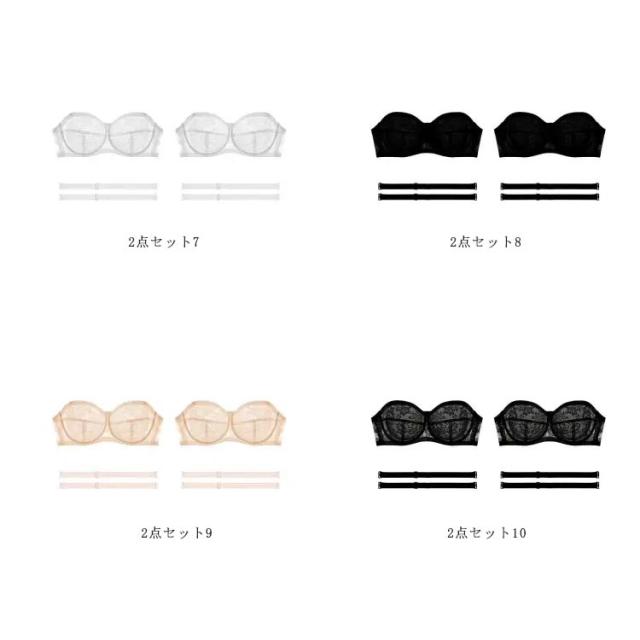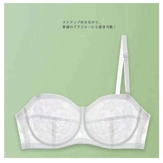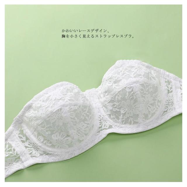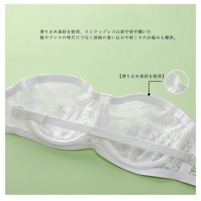 | 肩や胸元のあいたドレスにおすすめ! ずれないストラップレスブラに新作が登場です。 かわいいレースデザイン、胸を小さく見えるストラップレスブラ。 薄手レース素材を使用、綺麗なシルエットにカップ部分は柔らか素材で通気性があり汗ばむ季節も快適。 滑り止め素材を使用、ストラップレスは肩や背中開いた服やドレスの時だけでなく肩紐の食い込みや肩こりのお悩みも解決。 オフショルダー、キャミソール、どんな装いにも合わせやすく、幅広いシーンで大活躍するストラップレスブラジャー。 ストラップ付きなので、普通のブラジャーにも変身可能! オンにもオフにも使える万能ブラです。 | |