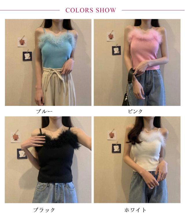 | 羽織のインナーやTシャツのレイヤードスタイルにおすすめなキャミソール。 フワフワ、キュートなフェイクファーがアクセント! 首元がすっきりと開いているので、アクセントにネックレスをプラスするのも素敵です。 身体にフィットする伸縮性抜群のストレッチキャミソールはスーツインナーには勿論!普段使いにもOK♪ | |