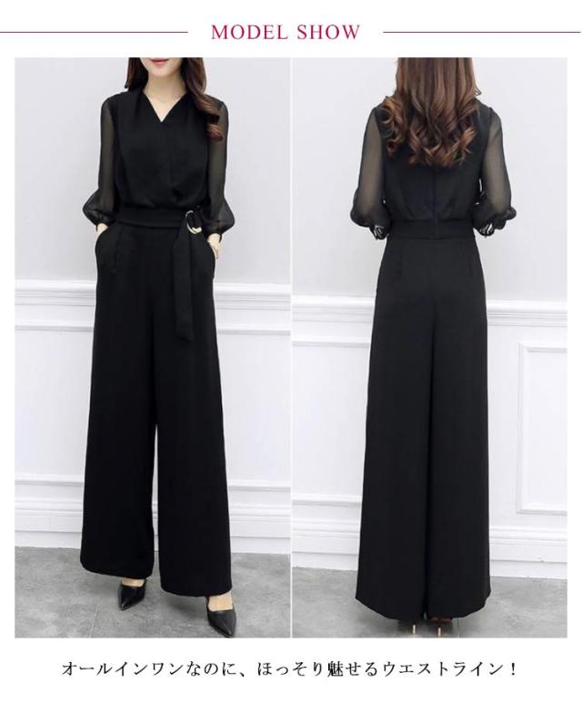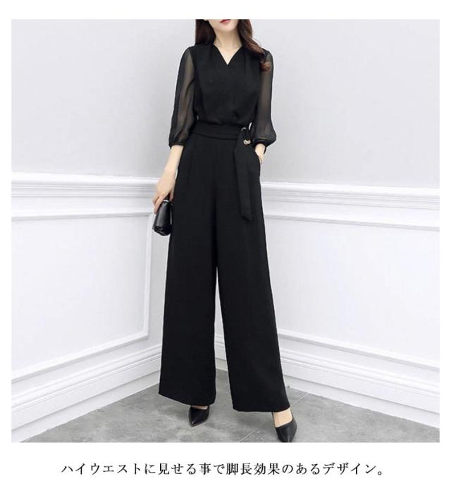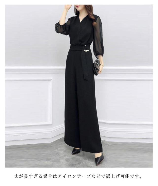 パンツドレス オールインワン 結婚式 二次会 お呼ばれ セレモニー 入学式 発表会 七五三 オケージョン ワイド ドレス パンツ お呼ばれ パンツスタイル 女子会 体型カバー 20代 30代 40代 七分袖 袖あり ブラック レディース ウエストゴム 大きいサイズ