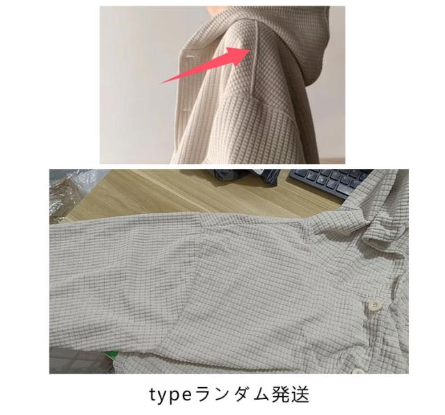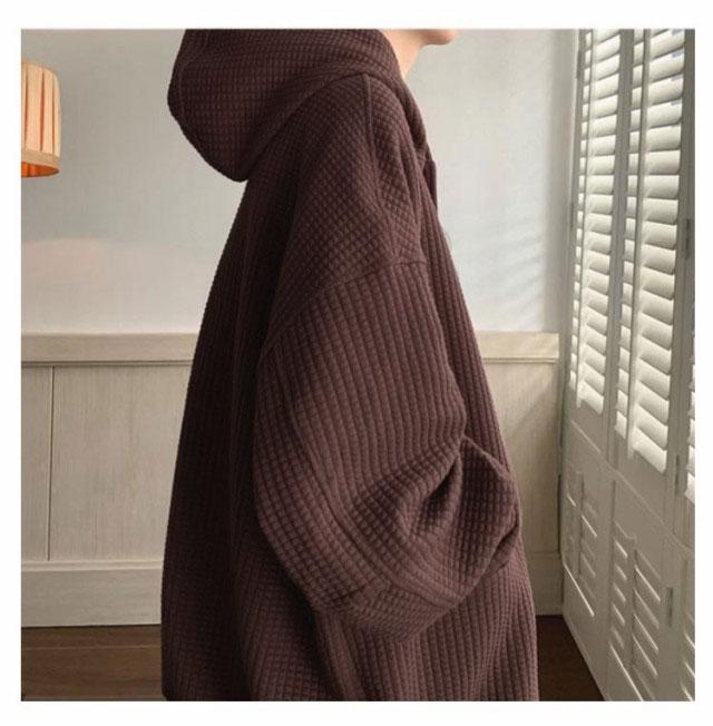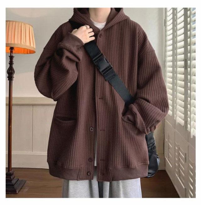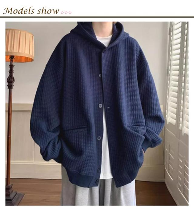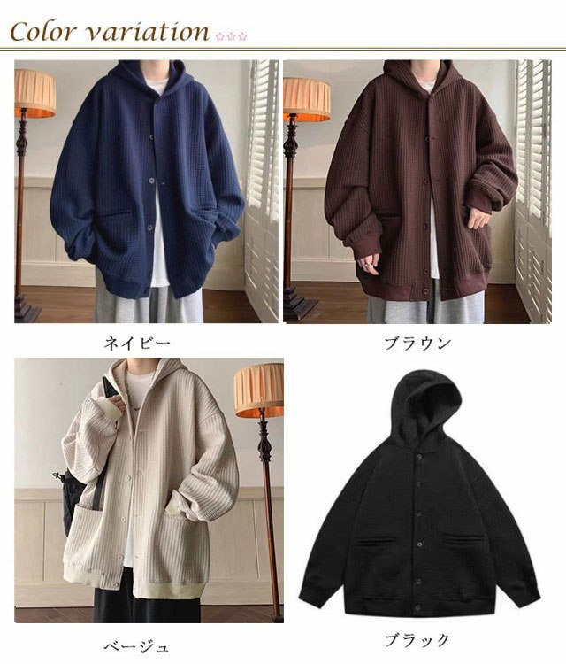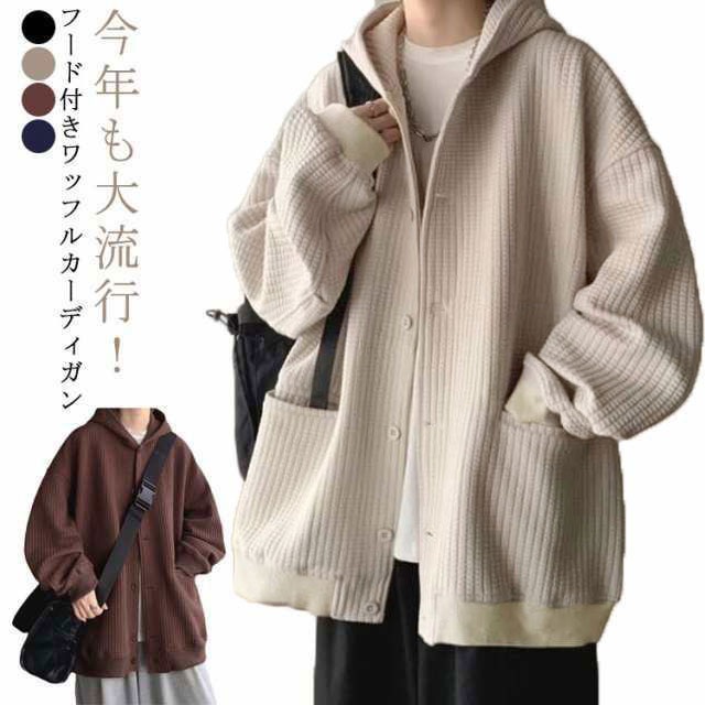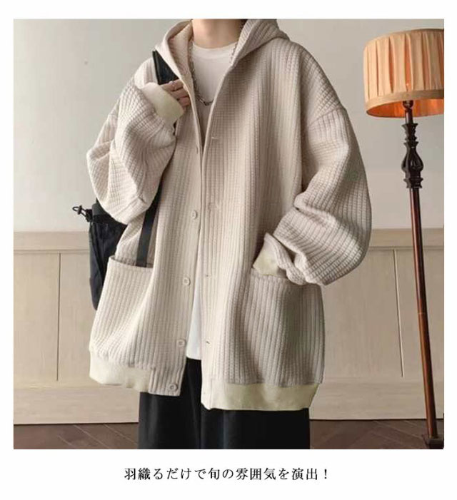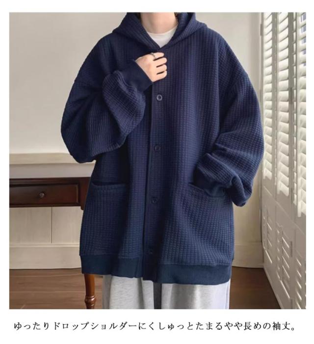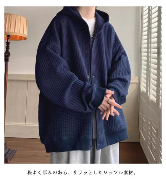 全4色【M-3XL】 ワッフル フード付き カーディガン メンズ 春 夏 秋 冬 vネック 長袖 ニット トップス 羽織 アウター コート ブルゾン スリーブ ボリューム袖 ゆったり 大きいサイズ オーバーサイズ プルオーバー 無地
