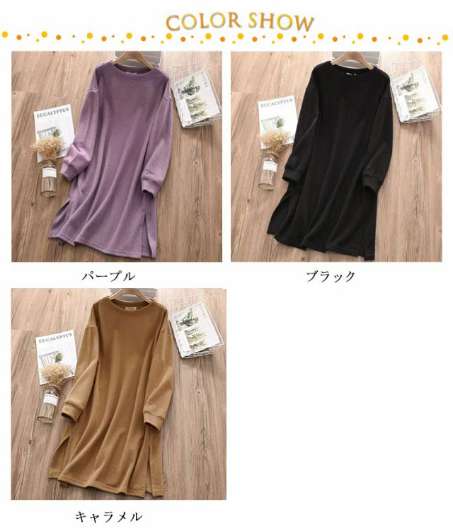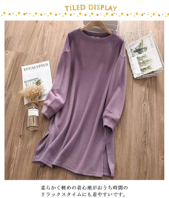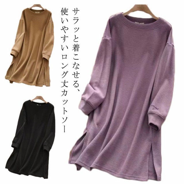 ロング丈tシャツ レディース 長袖 ゆったり ロングtシャツ 春秋 オシャレ カットソー 冬 ワンピース 部屋着 トレーナー 無地 シンプル きれいめ 大人 女性 チュニック サイドスリット インナー 大きいサイズ 体型カバー クルーネック ギフト プレゼント