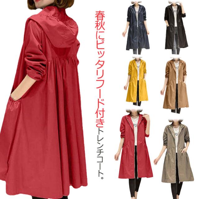 トレンチコート レディース スプリングコート 春服 春コート 春物 無地 ロングコート 長袖 フード付き 薄手 ライトアウター ジャケット カジュアル 大きいサイズ 体型カバー ビジネス 通勤 30代 40代 50代 60代