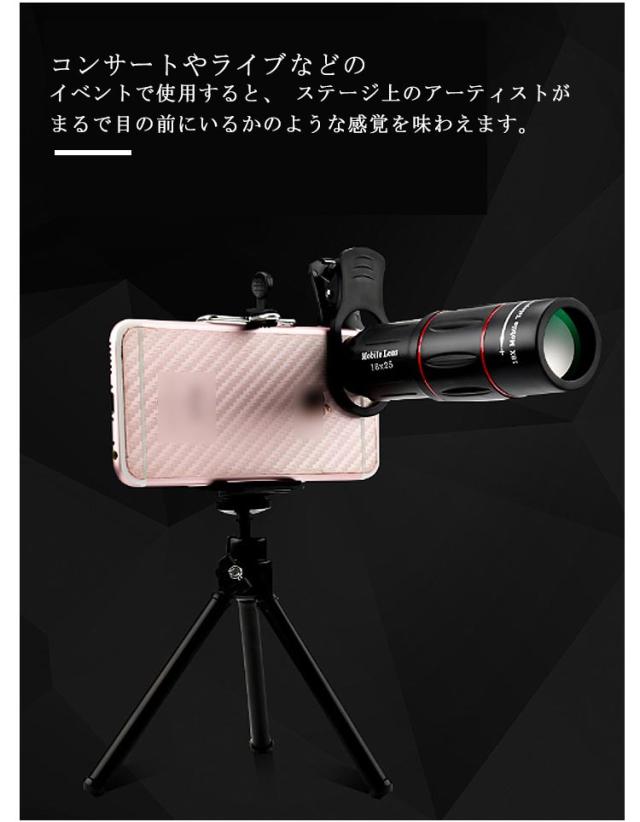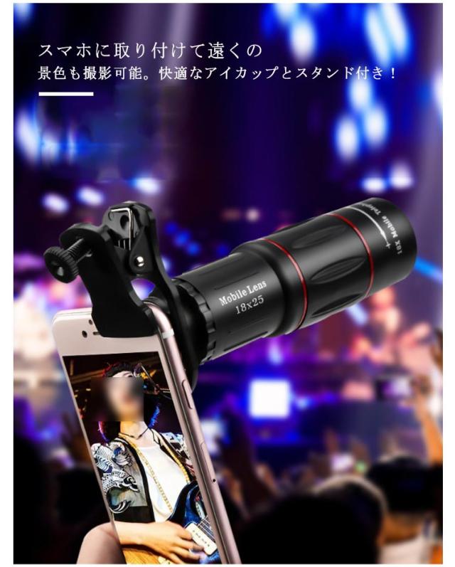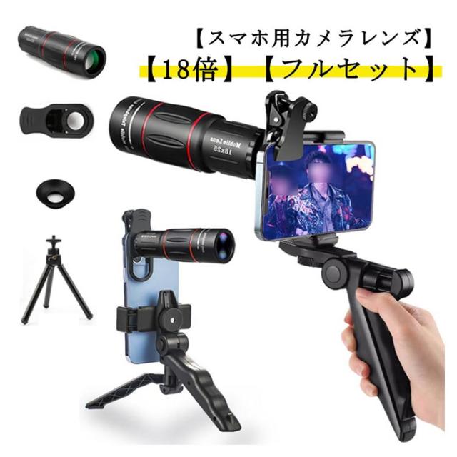 【フルセット】スマホ望遠レンズ ライブ専用 18倍 スマホ用カメラレンズ 単眼鏡 望遠鏡 セルカレンズ 望遠 望遠レンズ 携帯用望遠レンズ レンズセット スマホ用レンズ スマホに簡単装着 三脚付き iphone android