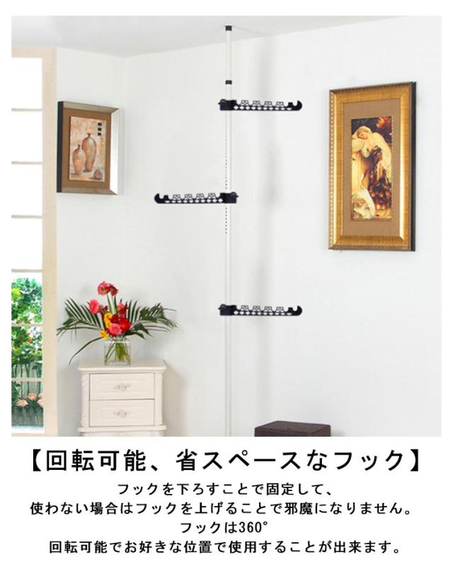 | 屋外やベランダでも使える強力突っ張り棒!部屋干しにも最適、限られたスペースを有効活用!上下伸縮バネ式で奥様でもカンタン固定。取り外しが簡単! 直径32mmの極太パイプで安定感も抜群です。 【つっぱり式でスペース節約】スリムなつっぱり式ポールハンガーは場所を取らずスペースを節約します。 【高さ調整自由なポール】ポールは高さ1.1〜3.1mまで幅広く調節可能です。 天井の高さによってポールを組み立てて高さを調節してください。 【回転可能、省スペースなフック】フックを下ろすことで固定して、使わない場合はフックを上げることで邪魔になりません。 フックは360°回転可能でお好きな位置で使用することが出来ます。 | |