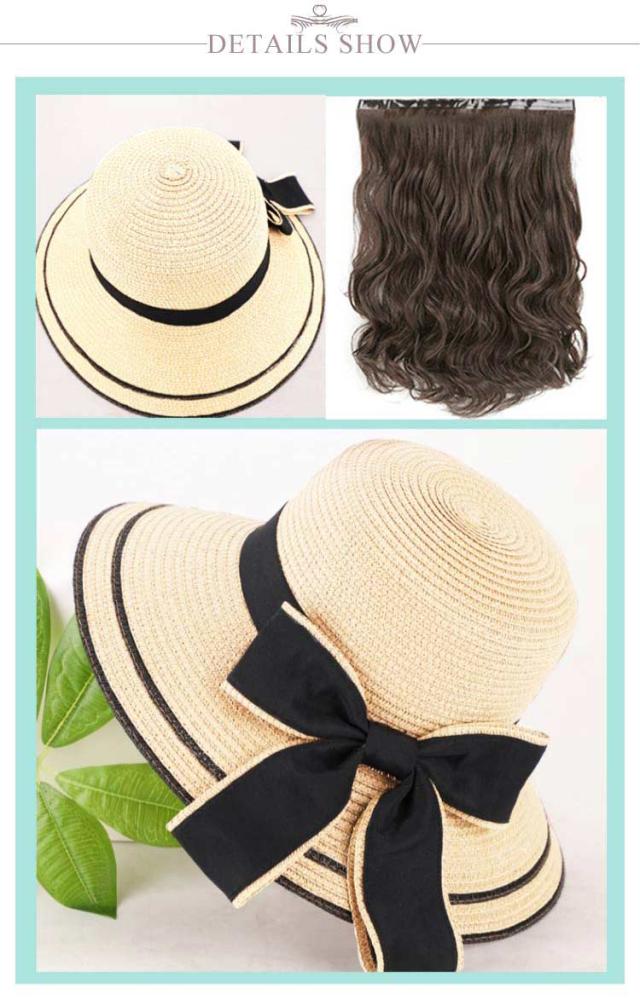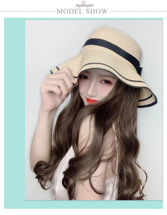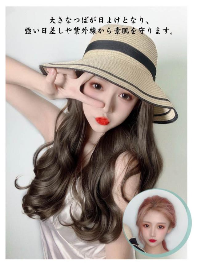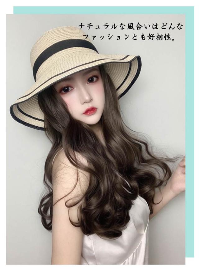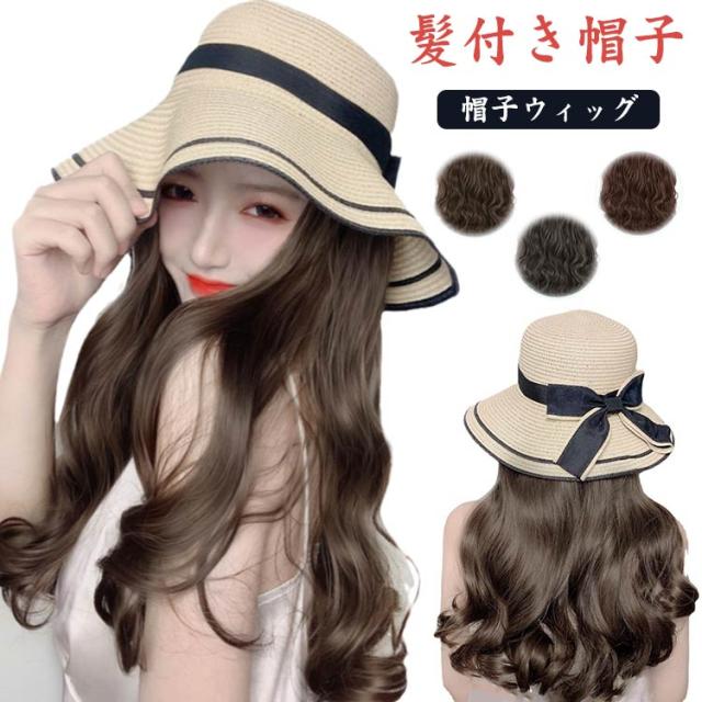 髪付き帽子 毛付き帽子 ウィッグ付き帽子 ウィッグ 取り外せる 帽子付きウィッグ レディース ウェーブ 45cm 麦わら帽子 リボン ストローハット つば広 普段使い 自然 人工毛 耐熱 ロング