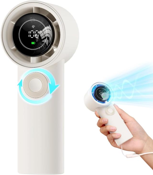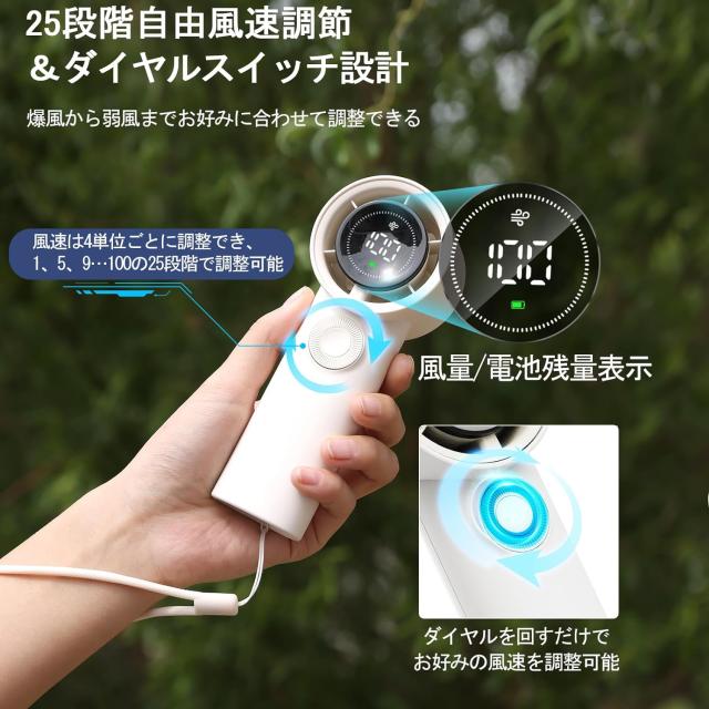 このポータブルなハンディ扇風機は、ダイヤルスイッチ設計を採用しており、風速は4下駄ごとに調整できるため、実質的に1から100までの25段階で調整可能です。さまざまなシーンでの風力ニーズに対応します。強力なモーターとタービン構造を採用しており、吸い込んだ熱気を急速に圧縮して冷却し、冷たい風に変えて放出します。これにより、暑い日でも瞬時に涼しくなります。また、ミニファンには高解像度のデジタル表示画面が装備されており、現在のバッテリー残量や充電状態、風速が一目で確認できます。バッテリー残量が少なくなった場合は、事前に充電を手配できるため、いつでも涼しい風をお楽しみいただけます。
