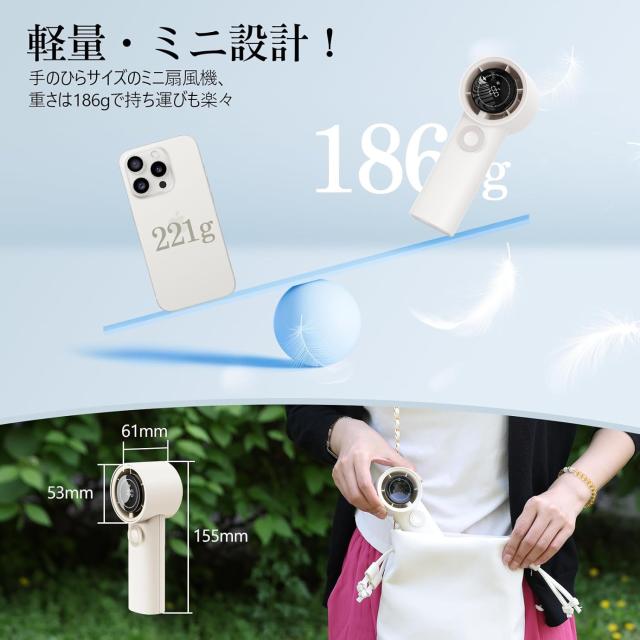 AOIMIRAIの手持ち扇風機の最高回転速度は、通常の個人用ハンディファンの3倍であり、ブラシレスモーターを採用しており、9m/sの強力な風を実現しています。最大回転速度は15000RPMに達し、パワフルな送風を実現し、猛暑でもより爽やかな涼しさを提供します。軽量(約186g)&コンパクトで、バッグに入れて持ち運びが便利!移動中に暑い外から室内に入った際に顔や首に当ててクールダウンするのに使ったり、屋外でのイベントやスポーツ観戦、旅行やキャンプなどのアウトドア活動にも活躍します。