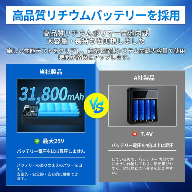 - 25v出力できるバッテリーが凄い!この出力がファンの回転数を飛躍的に上げて、強風を送り込んでくれます。バッテリーだけ、もう一つ買いたいぐらいです!