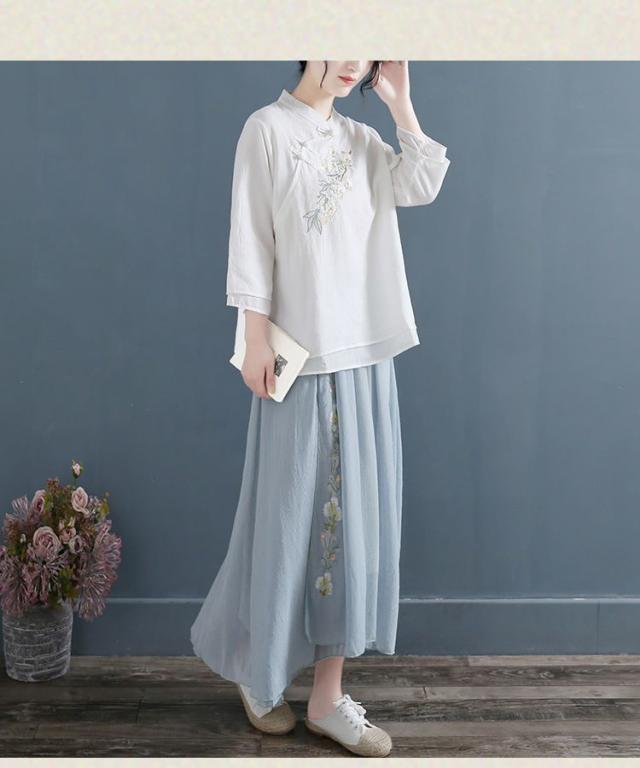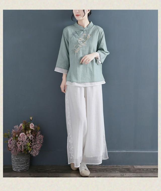 送料無料 ブラウス シャツ 7分袖 チャイナ シャツ トップス 花柄 レディース 綿麻 Tシャツ チャイナボタン 無地 中華 中国風 大きいサイズ ゆったり シンプル レトロ エレガント
