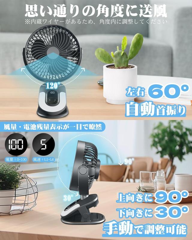 山誉 卓上扇風機 【2024年最新型 LEDディスプレイ表示】 クリップ式扇風機 20db静音 自動首振り USB充電式 5000mAh大容量 ミニ扇風機 6段階風量調節 LEDライト付き デスクファン 長時間連続使用 超強風 角度調節可能 熱中症対策 日本語取扱説明書付