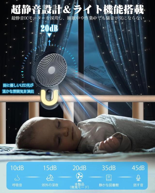 2024年に新開発されたUSB扇風機は左右の自動首振り機能を搭載し、自動で左右に125度、手動上下を120度調整が可能、様々な角度から各方向から清涼で心地よい風が吹きます。BLDCモーターのアップグレードにより、強力な風を生み出しながら最小限の騒音を実現しています。静音モードが搭載されており、約20dBと非常に静かで、オフィスや図書館、夜間などの静かな環境で快適にご使用いただけます。デスクファンは1%刻みで電量をデジタル表示し、充電のタイミングを正確に把握できます。この夏、心地よい風をお届けし、空気を循環させ、蒸し暑さを解消します。